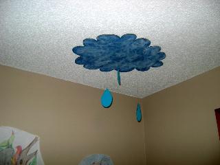 Little Hands: Crafty Kiddy Room Decor Sometime in the near future, we plan on switching the girls' room with the office. It's a bigger room and has two closets. Of course, when I say we, I mean me. Lance (my husband) is more the manual labor behind my bright ideas, and honestly, the way I work usually stresses him out. The theme for the girls' new room will be a nature one, which means Lance's current beige office will have to be painted, and....London's currently EXTREMELY pink room needs to be painted as well. (For some reason, Lance isn't into the three shades of pink for his guitars and desk?) Though nothing has really been started because I've been waiting until my spring break, I did have to start the ceiling decorations because the cardboard was going to get wet outside and was too huge to keep inside. I took a long piece and cut out three clouds and nine raindrops. I spray painted the clouds a pretty blue and then dry brushed white on it to give it texture. The raindrops were painted a lighter blue. Then I looped fishing line through the drops and tied it and then used a needle to pierce it through the clouds and taped it on the top. We nailed them up, but if the ceiling wasn't that popcorn texture, thumb tacks wedged into the curves of the clouds would have worked. So cute and really easy. I got the idea from the clouds around the light fixtures at the Memphis Children's Museum and decided to add further cuteness with the rain. Now I have to decide on a cute sun idea, since my friend Casey says it'd be depressing to make my kids live in rain nonstop without a sun. I'm excited to see what else comes out of this room as time passes. I tend to get carried away at times... And, if you're reading this and thinking, "Yeah...that's great, Heather, but I don't have near the time on my hands to make clouds and rain (or the inclination)," then try out crowns for your kids from cereal box cardboard, staples and aluminum foil. We made these one night during dinner, and it was just enough distraction to let me get dinner completely finished while she put stickers on and colored with markers for decoration. Then, along with Her Majesty, we got to eat in peace and on time. ; )