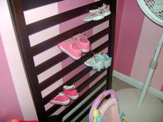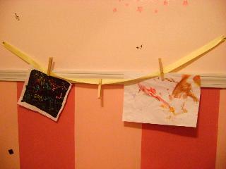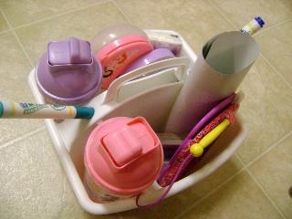 Little Hands: Tricks to Make Life Easier Hello all! I was wondering this past weekend what I'd share with you all today, and wasn't coming up with much. We decorated a bit for fall, went on a ridiculous amount of wagon rides through our neighborhood and read many, many books. I was helping London wash her hands at the sink, when it hit me, I'll do a post on a few of the practical little ideas around our house that makes things easier for the kiddos! First, I'll share our cup on the faucet, which is why the post idea came to me while washing her hands. We took a plain plastic cup that came from Chuck E Cheese. I used a knife and very carefully cut out the bottom part of the cup. Once it was cut out, I slipped the end of the cup, with the now open side, onto the faucet and pointed down a bit. Tada! The water runs down the cup and extends it several more inches so that London on a stool can easily reach the water without me having to hold her up and get her soap. Next, I wanted to share an idea I came across online to use the front of our crib. We have one of the cribs that just requires the front off easily for it to be transformed into a toddler bed. Currently, in the season we are in, the front may or may not be on the bed, depending on how many times London has gotten out of bed recently. Because of this, we can't keep it too far in case it needs to go back on. So, it is propped up, out of the way in her room, and her shoes slip inside of it as a holder. For a toddler that can put on her shoes by herself (for the most part), it's perfect to let her see the different choices, and keep them easy to reach. I also wanted to share London's art display. Not that I don't love my fridge covered in this week's lovelies, but I really like this idea because it also keeps her artwork a little more safe from a little sister. I simply put one piece of ribbon up on her wall and thumb tacked it on each side. I happened to have clothes pins on hand, but clippies or hairbows would work too. I just put each current piece up and rotate them through and they're off the floor, off my fridge, and out of Story's mouth. Another idea I learned from another mom. I used a cleaning caddy - I don't really know what they're called. It has a handle and storage areas on each side, and mine came with cleaning products my roommates bought our freshman year of college. I washed it out, and then filled it with car friendly things. Both of my parents live in Paragould, so it seems like we're never in the car, or we're there an hour. With this, I have snack containers for each girl with cheerios and dried cranberries, cups of water, kleenex, a small book, a magna doodle, color wonder paper, and a couple of the color wonder markers shoved into the holes on the top. It's nice because it also doubles as a car trash can, and can be easily picked up and taken inside to clean out and refill. It also makes going from my car to my husband's easier. Other ideas for it, depending on your childrens' ages could be sunglasses, cars, games, or clean craft things like noodles and yarn to make necklaces. The last idea I wanted to share I have no picture for. It was something we had up for awhile, but now that London is older and can climb more safely on a stool, it's no longer needed. I taped ribbon onto her light switch and ran it up and to the right and around a small screw in hook. Then the rest of the long ribbon hung down. She could easily pull the ribbon to turn on her light when needed. I never fixed it to turn off because I didn't exactly want her to be able to, but it was so nice to not have to drop everything to go turn her light on just so she could find her cup or something, especially when I had a new baby.