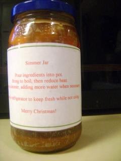 Little Hands Make Simmer Jars for Christmas Can you believe it's so close to Christmas?! I'm so glad we have all of our shopping done and can just enjoy the holiday. I do have a few gifts left to make, however. Out of all the easy homemade gifts, my favorite, I've recently decided, is the Simmer Jar! I almost always have stove top potpourri on, but it never occurred to me to jar it and give it as a gift until Pinterest. Every year, there are a few people on my list that leave me absolutely blank when trying to think of a gift idea for them. This year, I've decided to do some cookies in a jar, and simmer pot potpourri in another. To make them, you can buy some mason jars, or use re purposed jelly or whatever jars. Then you put in the ingredients and fill to the top with water. I have to be honest, as usual, I didn't measure anything in my jar. I threw in the peeling from an entire orange, three half cinnamon sticks, about a teaspoon of pure vanilla extract, then some ginger, cloves, nutmeg, and some more cinnamon. Then I filled it with water. You simply pour the contents of the jar into a pot, bring to a boil, then reduce to simmer. Then add water as needed, which usually is about every 30 minutes or so. I printed out the instructions in Word to tape on for the recipients too. London really got to help in this too, which she liked. She got to shove in all the orange peelings, cinnamon sticks, and (since I never measure anyway) shake in the seasonings. It will be fun when we give them and she gets to say she helped make them.