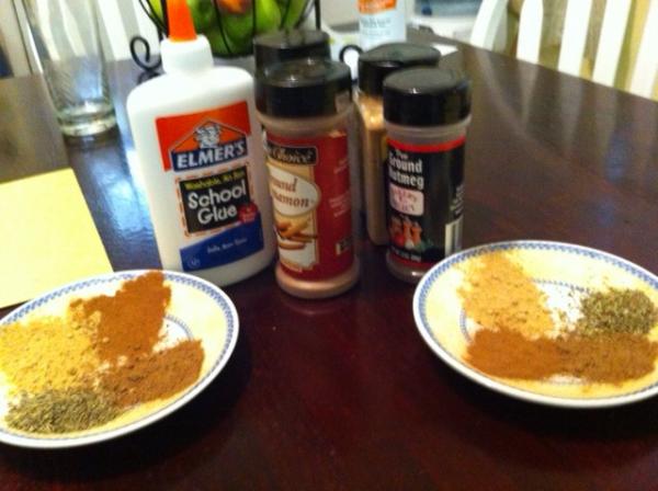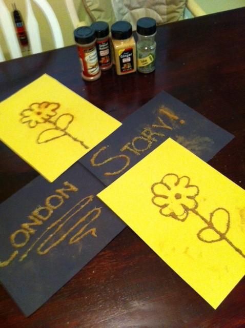 Sensory Play with Little Hands I'm a big fan of sensory play. I big fan. Sensory play is basically just a way for your children to play that uses as many of a child's five senses as possible to learn. It takes some searching for new ideas and a lot of intentionality, but it's worth it. We're in the middle of the midsummer time blues. Do you have those at your house? You start out the summer strong with lots of fun and play, but somewhere along the way, it gets hot and boring. I never realized how important holidays are to young children to keep things changing, until summer and the lack of holidays. There's Independence Day, but when they're really little, it's hard to make that a big deal. Trust me, my history minor will come out strong every July when they're older. However, in this arts and crafts loving house, the back to school supplies going on sale is very much like a holiday! In comes the sensory play. We went to Walmart yesterday and stocked up on the art supplies that have slowly dwindled down over the last several months. We keep a low cabinet in the kitchen full of washable paint, safety scissors, pipe cleaners, tape, and anything else that the girls could use to create. Today, London wanted to use our new Elmer's glue, and I wanted to include as many senses as possible. We've all made a picture on paper out of glue to sprinkle on glitter and shake off, but I wanted it to be a little different. I have a large number of cheap cooking spices that I use for stovetop potpourri, so I took out four of them and sprinkled a little of each on saucers. I drew some flowers on paper for them, and let them sprinkle the spices on to the glue. It was neat to watch them smell and taste each to decide which one they liked the most. They weren't fans of the taste of any, of course, but cinnamon and Italian seasoning were their favorite smells, which I was surprised on that last one. The other two I used were nutmeg and ginger. Next I wrote their names on new pieces of paper and let them mix all the spices together to sprinkle on. It was really fun and easy clean up. After they were done and on their way to play, I just shook all the leftover spices into a small pot to add vanilla and water and make some potpourri on the stove. Easy peasy. My 22 month old actually understood much better than I expected, and she was really good at this activity! One tip: keep baby wipes close at hand. If they rub their eyes, those spices don't feel so great in the eye. But even when my 3 year old got it in her eyes, I wiped her eyes with a wipe and she was happy again!
