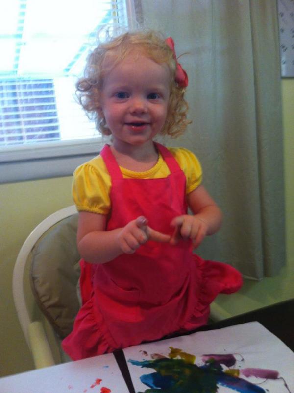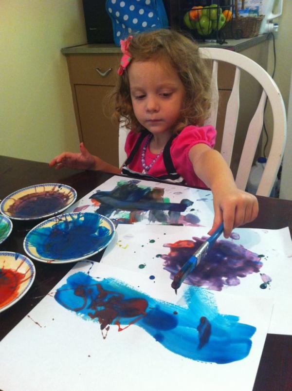 Little Hands: Cool (Indoor) Crafting I hope everyone had a great holiday weekend! Monday is normally my cleaning and/or laundry day, but that got pushed back to today and one more day of weekend mess added, so it's been busy around here! I'm glad I had a reason to sit down and pick up my computer for a minute. I'm not a very artistic person. In fact, I'm not artistic at all. When I was young and all art consisted of drawing, coloring and painting, I was awful at it. It wasn't until I was much older and discovered the ability to be creative with fabric, spray paint, and hot glue that I even seemed a tad "creative." Sometimes, I wonder if I wasn't so great at creativity until adulthood because of the lack of time I dedicated to it. Because of this theory, I really spend a lot of time encouraging my girls in all things creativity. Painting is really our go-to activity, and I really think it's because they like the mess but that's okay. Sometimes, the same old washable paint can even get boring though. When that seems to be happening, I either focus on something else and keep them from painting for awhile so that it's fun and new again later, or I switch up the paint. A few weeks ago, it was just such a time, and the heat keeping us inside removed the ability to take away painting for a bit. That left me with trying to find a way to make it fun again. Enter, sweetened condensed milk. Yes, that's right. First, you pour a little bit of the milk into several different small bowls, then you add food coloring to each to make them all different colors. It makes a pretty shimmery paint that looks really wet. London thought it was perfect for painting water and sea animals. It is edible, which the girls discovered after several minutes of painting. Luckily, they didn't exactly eat it, but when it got on a finger, they did lick it off with big smiles. A sweet paint was a very pleasant surprise, and made something fun that had become old much more fun again.