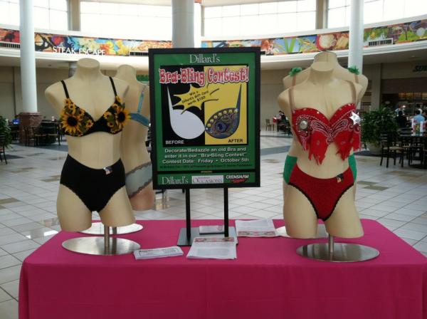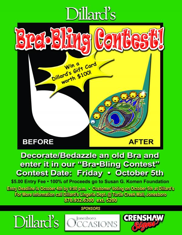 Bling a Bra for Breast Cancer Research Bling your bra this week to raise money for breast cancer. Dillard's is now accepting blinged-out bras to benefit breast cancer research. Entries should be submitted before 9 p.m. on Thursday, October 4. Anyone can enter! Voting will be held on Friday, October 5, all day long. A person can vote by visiting the Dillard's entrance to the mall and placing money into the jar of the bra that they like the most! The bra that raises the most money will win a $100 Dillard's Gift card. All money collected during voting and entry fees will go directly to the Arkansas Affiliate of Susan G. Komen. "We are very excited about this fabulous event and hope all women will participate," said Candice Moore of Dillard's, who is organizing the fundraiser. "All women wear bras, so why not put a little bling on them for a great cause? Help us raise awareness for breast cancer in style." Sponsored by Dillard's, Jonesboro Occasions and Crenshaw Signs. [+] add comment |