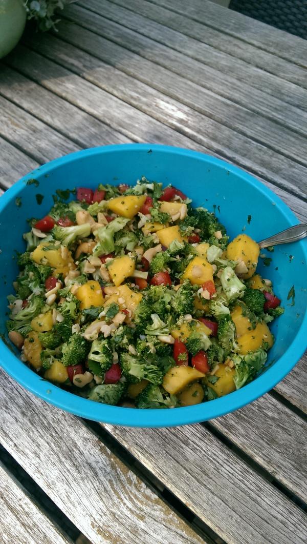 Thai Broccoli Salad 2 heads of broccoli, finely chopped (I didn’t use much of the stem) 2 mangoes, sliced into bit sized chunks 1 bell pepper, chopped 1 cup cashews, coarsely chopped 1/4 cup cilantro, chopped Toss these ingredients in a salad bowl then make the dressing.