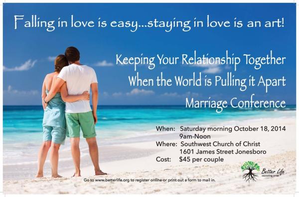 Keeping Your Relationship Together When the World is Pulling it Apart Marriage Conference will be held on Oct. 18, 9 a.m.-Noon, at Southwest Church of Christ, 1601 James Street. The cost is $45 per couple.