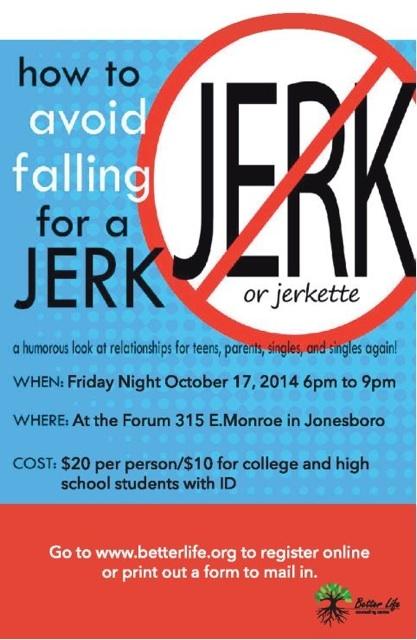 How to Avoid Falling for a Jerk or Jerkette will be held on Friday Oct. 17, 6-9 p.m. at the Forum, 315 E. Monroe. The cost is $20 per person or $10 for college and high school students with ID.