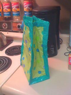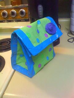Little Hands' No-Sew Lunch Box I had another post topic in mind today, but...it has rained a lot, cancelling out the fun we were going to have that I was going to blog about. I thought I'd share, instead, London's little lunch bag that she takes to a babysitter once a week. I found the oilcloth tablecloth at a thrift store brand new for $1. I wish I had a tutorial for this, but I forgot to take pictures along the way. Luckily, you can google this and find several websites with instructions including Martha Stewart's site. I cut two long pieces and four shorter ones for the sides. I didn't want to deal with the slipping around, so I actually put a little hot glue on the back of each piece and put them together so the nice side was facing out on both sides. I then folded the long piece and sewed on the sides. However, my sewing machine was having serious issues and I ended up getting a new one, but at the time, I was stuck. SO, I pulled out the cute turquoise duck tape that I have, and seriously just duck taped over the places that needed to be sewed. I made a little blue rosette out of a tshirt scrap and hot glued it on as well. Last, I took some Velcro and put it inside to make the bag close while standing up, and then another two pieces on the front to make the bag fold down and close. Ta da! No sew lunch bag for $1! Happy Mother's Day this weekend! Maybe the rains will stop soon, and I'll get to share a day of School's Done, Summer Fun! celebrations! Or, we'll just call it, Yay! a Sun! party. hehe