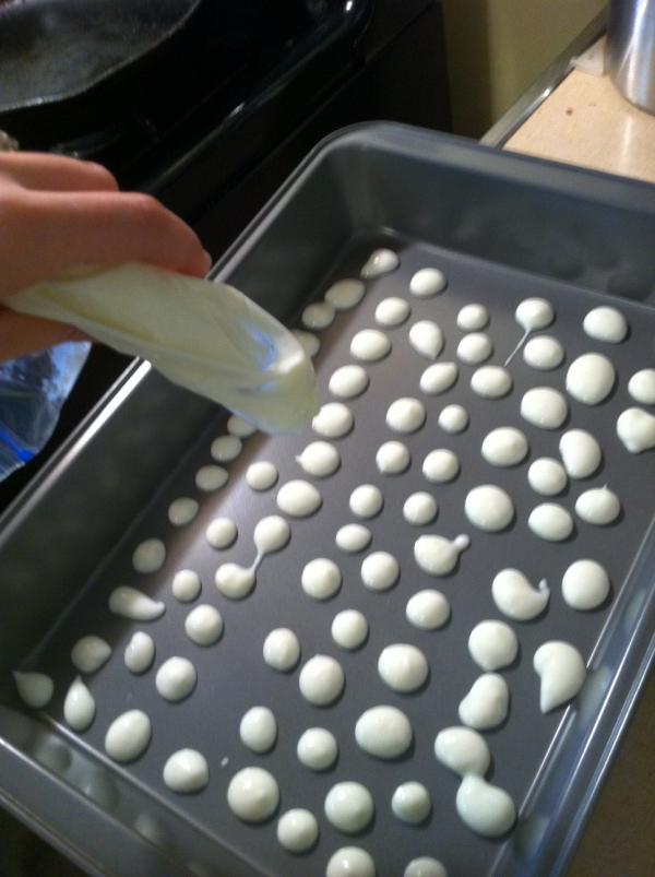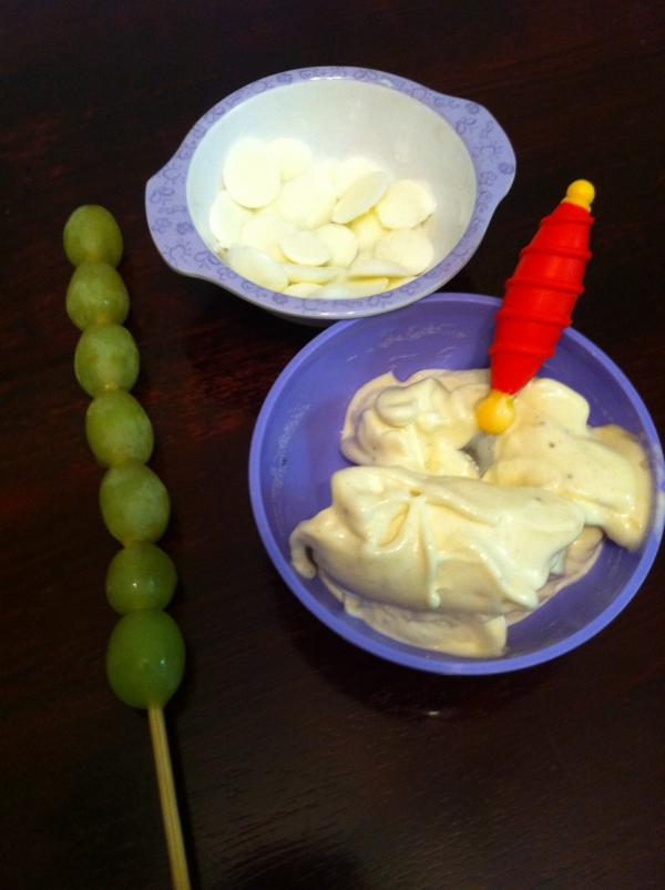 Little Hands: Homemade Frozen Treats My girls love sweets as much as any other kid, but frozen treats seem to be their favorite. We indulge in some sugary fun every once in awhile, but if I let them have icecream or popsicles as often as they'd like, they'd never eat real food! So, I have to get creative. I have found three treats to take something really great for them and make it look like something just really yummy. First is a grape popsicle. We string grapes on wooden skewers and freeze them. That's it. But the fun my preschooler has before dinner stringing them would be enough, even if they weren't a perfect, sweet after dinner treat. It helps me give her something to stay busy and out from under my feet as well. Next, we discovered frozen yogurt drops! You sit a ziplock bag into a cup for stability, then fill it with about a cup of your favorite yogurt. Then, cut a tiny hole in one of the bottom corners of the bag and drip little dots of yogurt onto the bottom of a cake pan. I say a cake pan because it is more mess free for those helping hands. Stick the whole thing in the freezer, and then put the dots into a bowl to eat when they're done! Last, banana ice cream! You slice a banana onto a plate and put the plate into the freezer. Once they're frozen completely, put them into a food processor. First, it'll make banana gravel. Keep chopping and maybe pushing it down here and there, and as it thaws a bit more, it becomes creamy. I have no idea why, but frozen and puréed bananas have the exact same consistency of the creamiest soft serve ice cream ever! You can eat it soft, or put it back in the freezer a bit to scoop onto cones later. You can add flavor to it as well. We've tried peanut butter and cocoa, which was good, and other fruits too. Plain, it surprisingly has very little banana taste, so anything you add only adds to its creamy taste. All of these take less than an hour to make and freeze. We made all three today to show you all a couple pictures and my kids now think we're celebrating something, and it's only fruit and yogurt! Win.