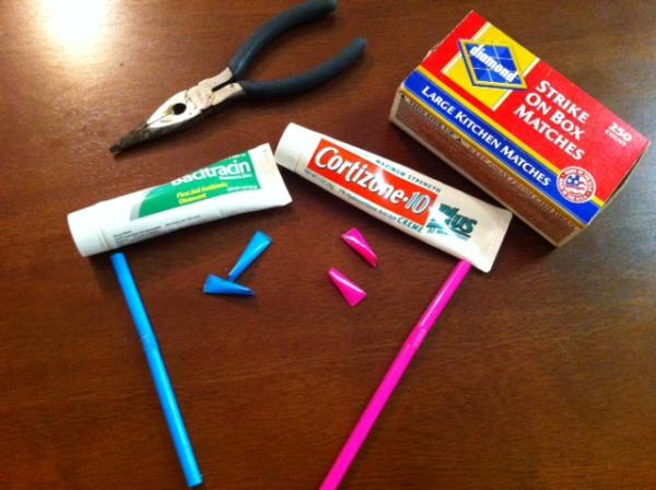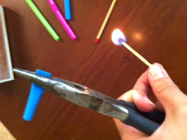 Simply cut the straw into small sections. At one end, squeeze it closed with the pliers and melt the ends together to seal it. Fill with a drop of medicine. Then seal the other end the opposite direction the first end is sealed. Once they're closed, you can throw them into a diaper bag or purse and pinch them open when needed. I love them. My mind has always filled with ideas of homemade pixie sticks and honey filled sticks. Even organization! Fill with small amounts of glitter or paint for kid crafts! Oh, the possibilities.